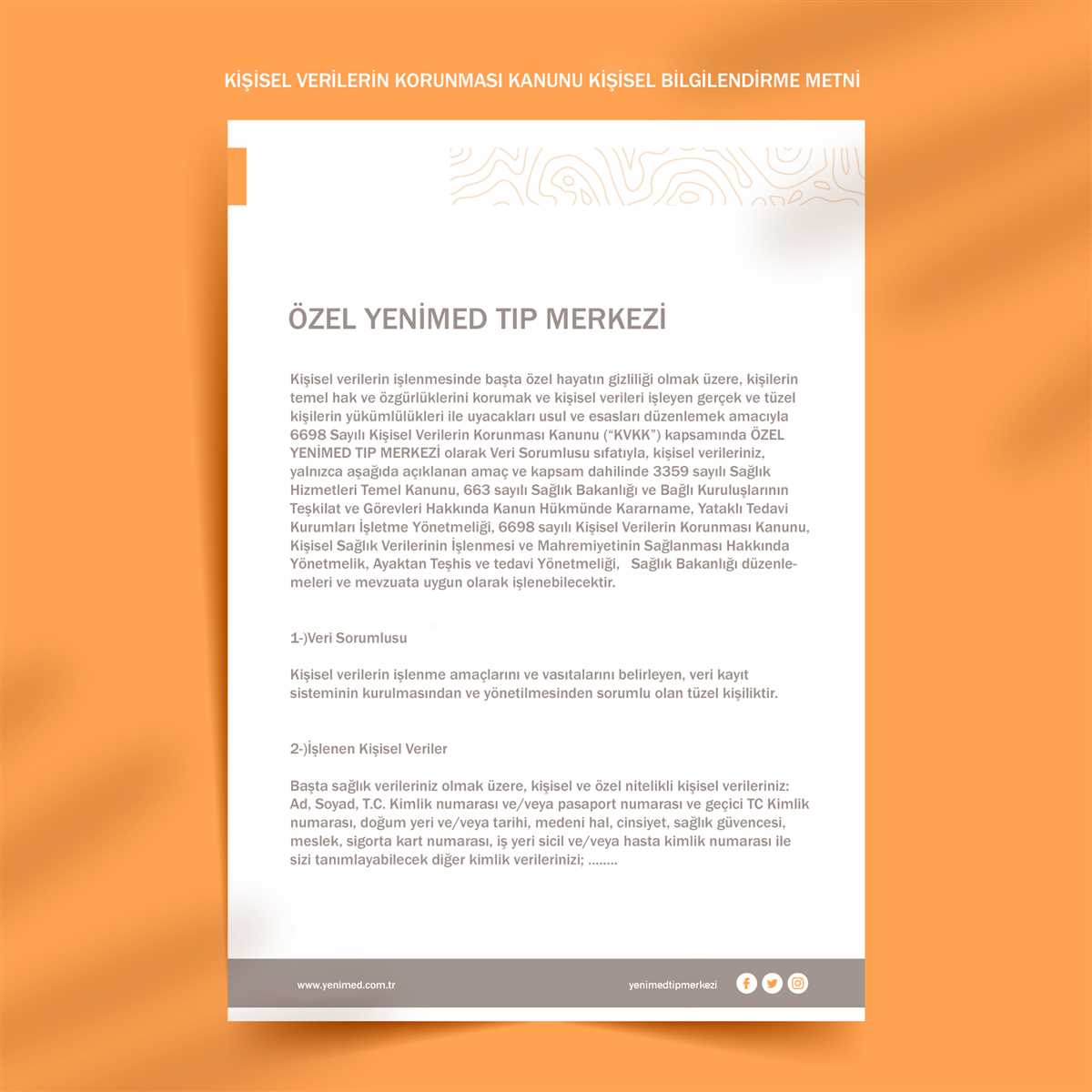 Kişisel verilerin işlenmesinde başta özel hayatın gizliliği olmak üzere, kişilerin temel hak ve özgürlüklerini korumak ve kişisel verileri işleyen gerçek ve tüzel kişilerin yükümlülükleri ile uyacakları usul ve esasları düzenlemek amacıyla 6698 Sayılı Kişisel Verilerin Korunması Kanunu (“KVKK”) kapsamında ÖZEL YENİMED TIP MERKEZİ olarak Veri Sorumlusu sıfatıyla, kişisel verileriniz, yalnızca aşağıda açıklanan amaç ve kapsam dahilinde 3359 sayılı Sağlık Hizmetleri Temel Kanunu, 663 sayılı Sağlık Bakanlığı ve Bağlı Kuruluşlarının Teşkilat ve Görevleri Hakkında Kanun Hükmünde Kararname, Yataklı Tedavi Kurumları İşletme Yönetmeliği, 6698 sayılı Kişisel Verilerin Korunması Kanunu, Kişisel Sağlık Verilerinin İşlenmesi ve Mahremiyetinin Sağlanması Hakkında Yönetmelik, Ayaktan Teşhis ve tedavi Yönetmeliği, Sağlık Bakanlığı düzenlemeleri ve mevzuata uygun olarak işlenebilecektir.